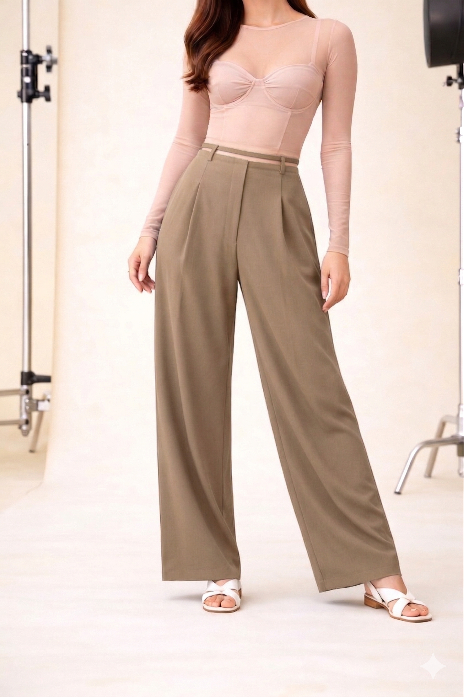 Designed for effortless elegance, the Aveline Drape Pleat-Front Wide-Leg Trouser brings together structured tailoring and fluid movement in one refined silhouette. The high-waist fit enhances the natural shape, while the soft front pleats create a graceful drape that falls into a clean, elongated wide leg. Crafted for modern women who prefer comfort without compromising sophistication, this piece transitions seamlessly from workwear to evening styling.