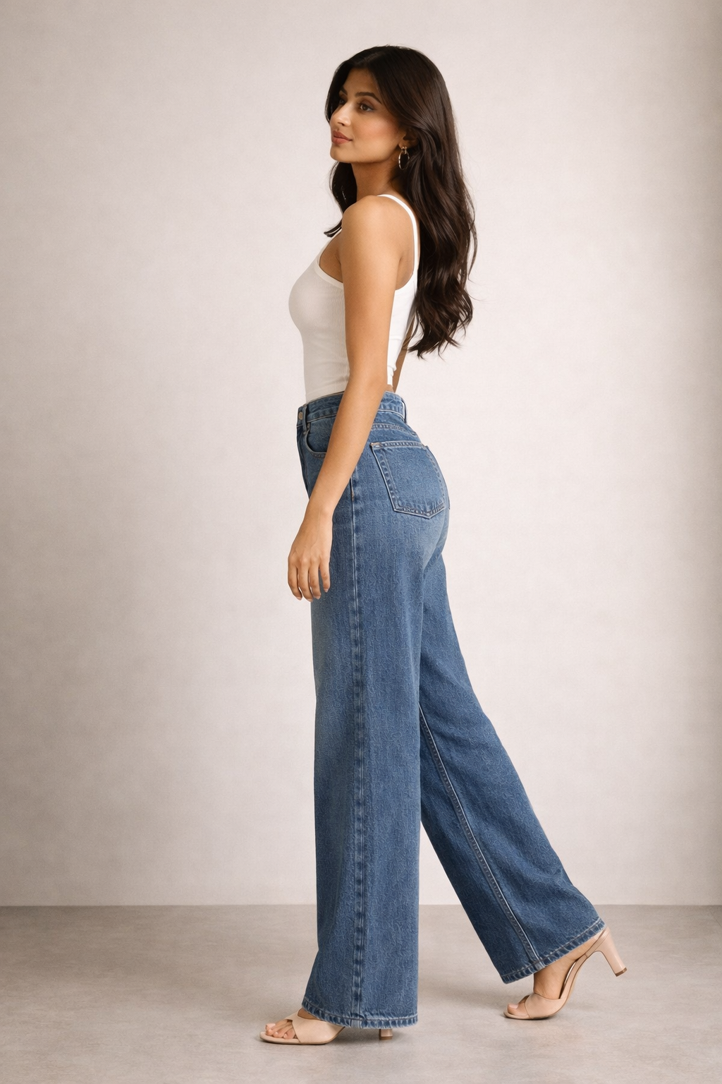 The Azure Drift Wide-Leg Denim showcases a fresh mid-blue tone with soft fade detailing that enhances its premium finish. Designed with a flattering high-waist fit and a straight flowing wide-leg cut, it creates a balanced, elongated silhouette. Ideal for daily wear or polished casual looks, this piece brings understated elegance to your wardrobe.