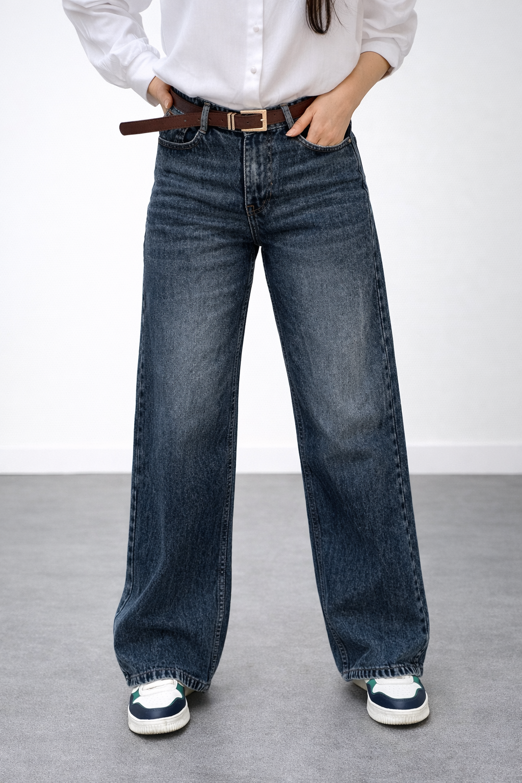 The Core Drift Wide-Leg Denim features a rich dark-blue tone with soft center fade accents that enhance its premium finish. Its high-waist silhouette flatters the natural shape, while the relaxed wide-leg cut creates a smooth, elongated fall. Ideal for both casual and polished outfits, this denim delivers a confident, refined look with all-day comfort.