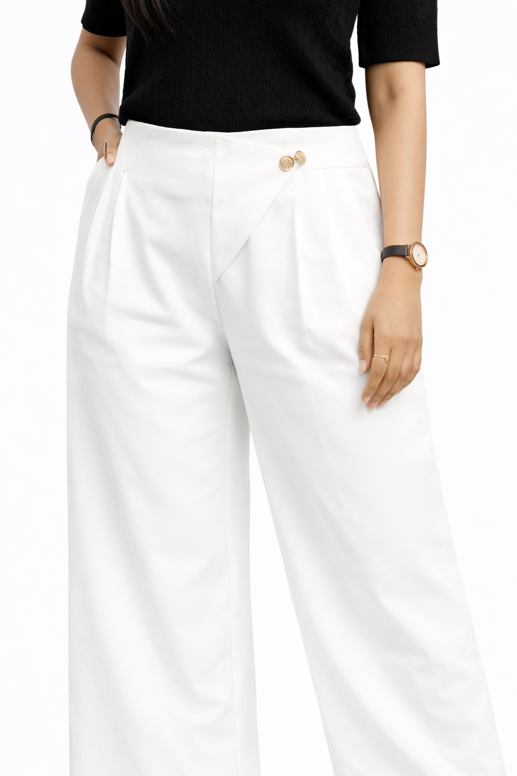 High-waist structured fit with relaxed lower fall.